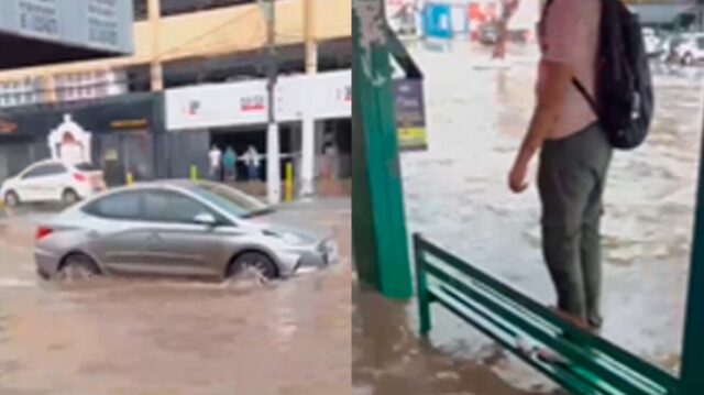 Vídeos que circulam nas redes sociais mostram a avenida Tenente Coronel Duarta (Prainha) completamente alagada e pessoas se protegendo em paradas de ônibus.