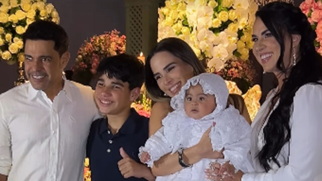 Graciele Lacerda, 44 anos, e Zezé Di Camargo, 63, celebraram nesta segunda-feira (18), o batizado da primeira filha do casal, Clara. A cerimônia católica teve entrada especial ao som de Bondade de Deus, interpretada por Wanessa Camargo, filha do cantor com Zilu Godói.