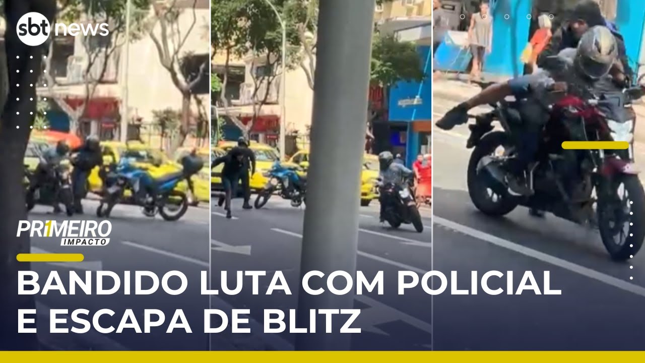 Durante uma blitz no Rio de Janeiro, dois suspeitos reagiram à abordagem policial e conseguiram fugir. Um deles lutou com o agente e subiu na garupa de uma moto conduzida pelo comparsa. A dupla acelerou e escapou, enquanto o policial tentou persegui-los sem sucesso. O vídeo da fuga circula nas redes sociais. A PM informou que reforçou o policiamento na região e trabalha para identificar os envolvidos.