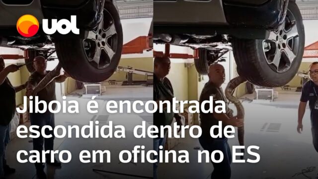 Jiboia foi encontrada escondida dentro do carro que estava em uma oficina na Serra (ES). Os mecânicos encontraram o bicho ao retirar o capô do veículo e acionaram a Polícia Ambiental. O réptil foi resgatado e solto em uma área de proteção ambiental do Mestre Álvaro. Ninguém ficou ferido.